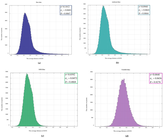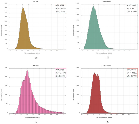 A statistical graph of the average distance of KNN: this average distance is used to evaluate the degree of data dispersion. We calculated three evaluation parameters for the initial and several filtered data. The standard deviation is expressed as . The mean variation is expressed as . The range is expressed as . (a) A statistical graph of the raw data, (b) a statistical graph of the data filtered by the artificial filter, (c) a statistical graph of the data filtered by the SOR filter, (d) a statistical graph of the data filtered by the VGSOR filter, (e) a statistical graph of the data filtered by the ROR filter, (f) a statistical graph of the data filtered by the Gaussian filter, (g) a statistical graph of the data filtered by the DON filter, and (h) a statistical graph of the data filtered by the GPCA method are presented.