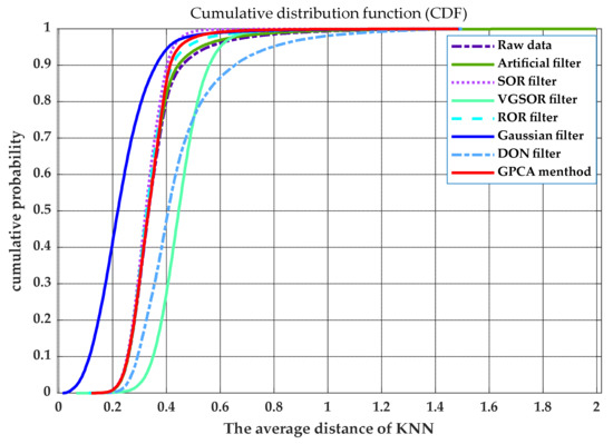 The degree of dispersion of point cloud data can also be used as one of the indicators in evaluating the quality of filtering. Therefore, we used the principle of the SOR filter to obtain the statistics on the average distance of KNN. The dispersion degree of point cloud data after filtering was judged by analyzing the dispersion degree of statistical data. As shown in Figure 10, the statistical data of eight types of data were compared, and the indicators of each type of data were calculated. The smaller the values of the three indicators, the lower the degree of dispersion of the data. Figure 11 is the cumulative probability distribution of the statistical data. When the value of the cumulative distribution function changes from 0 to 1, the faster the abscissa changes, the lower the degree of dispersion of the data. The SOR filter is designed based on the dispersion of data. Therefore, our method is slightly worse than the SOR filter but higher than other filters in terms of the dispersion of the data.
