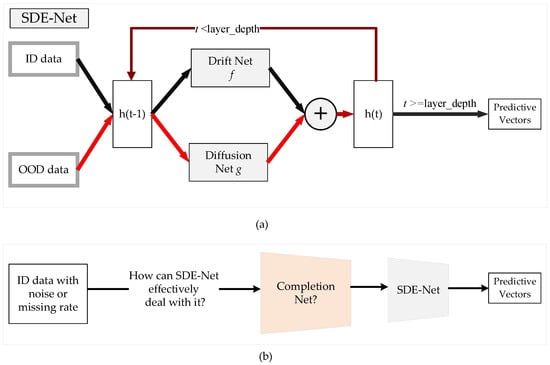 Recently, a novel SDE-Net for uncertainty estimation of DNNs has been proposed to capture epistemic uncertainty using Brownian motion or the Wiener process [,], which are widely used to model uncertainty or randomness in mathematics, physics, economics, and other disciplines [,]. SDE-Net uses two separate neural networks (NNs): the drift net f is designed to control the system in order to achieve a good predictive accuracy for in-distribution (ID) data, while the diffusion net g is used to control the variance of the Brownian motion based on the ID or OOD regions. SDE-Net can not only explicitly model aleatoric uncertainty and epistemic uncertainty in its predictions for classification and regression tasks, but also does not need to specifically model prior distributions and infer posterior distributions as in BNNs. SDE-Net can achieve good performance and uncertainty estimation between ID and OOD data; however, in practice, ID data are generally encountered with noise or high missing rates. The purpose of this paper is to explore how to effectively deal with ID data with noise or high missing rates for SDE-Net. Our idea is to first fix the noisy ID data with a completion net, and then process the completed data with SDE-Net for uncertainty estimation. The components of SDE-Net are described in Figure 1a, and the resolution of SDE-Net’s problems is explained in Figure 1b. Figure 1 shows that SDE-Net lacks consideration of the general situation in a wider field—that is, ID data with noise or high missing rates in practice.