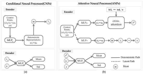 Architectures of CNPs and ANPs. (a) Components of a CNP model: the encoder of CNPs is composed of a deterministic path to generate a representation r; the decoder of CNPs uses the r and target  to produce the mean and the Std. (b) Components of an ANP model: the encoder of ANPs is composed of a deterministic path to generate a representation  and a latent path to generate latent variable z; the decoder of ANPs uses the , z, and target  to produce the mean and the Std.