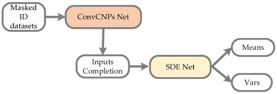 The process architecture of the ConvCNPs–SDE model for masked ID datasets. ConvCNPs-Net is used to complete the masked ID data, and then the completed data is processed with SDE-Net to produce Means and Vars.