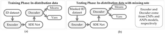 In Figure 5a, the ID dataset is used to train the CNPs–SDE or ANPs–SDE models; the encoder and decoder are from the CNPs and ANPs models, respectively, so as to generate the parameters Means and Vars of normal distribution. In Figure 5b, a masked ID dataset is utilized to test the performance of the constructed vNPs–SDE model when facing the ID dataset with noise or a high missing rate.