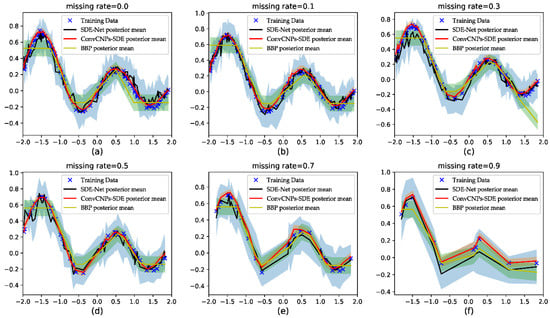 The results of the three models—namely, BBP, SDE-Net, and ConvCNPs–SDE—are plotted in Figure 6 for synthetic 1D data. Due to MC-dropout method not fitting the GPs dataset, the results of MC-dropout are not shown in Figure 6. More specifically, our proposed ConvCNPs–SDE model can fit the synthetic 1D data better and produce smaller variances than the BBP and SDE-Net models. When MR is 0.9, we find that the results of the BBP and SDE-Net models deviate from the data. At the beginning and the end of the training set, BBP produces worse results than SDE-Net and ConvCNPs–SDE; this may be due to the learning Bayesian phase at the beginning and the uncertainty introduced about unseen data [].