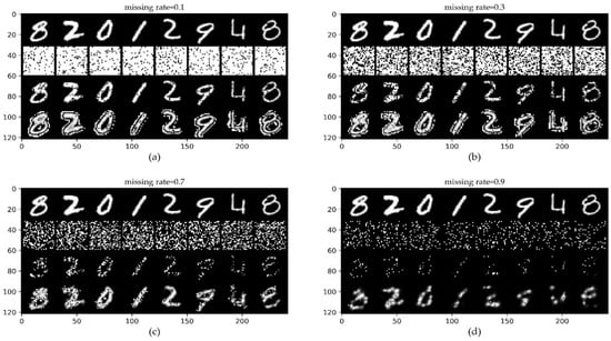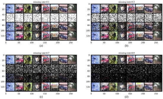 ConvCNPs-Net for CIFAR10 with MR. (a–d) show that the missing rate takes values from [0.1, 0.3, 0.7, 0.9], respectively, to test the performance of the trained ConvCNPs-Net and ConvCNP–SDE models. For each panel, the top row shows the original ID data of CIFAR10, the second row demonstrates the mask based on MR, the third row exhibits the CIFAR10 data with the mask, and the bottom row displays how the masked CIFAR10 data are completed by the ConvCNPs of the ConvCNP–SDE model.