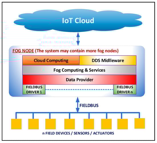 From the software point of view, the fog node is organized into four layers: fieldbus drivers, data provider, fog computing & services, and middleware (Cloud Computing & DDS middleware). Between these layers, there are defined standard software interfaces that allow the independent design and execution of the software modules associated with each layer.