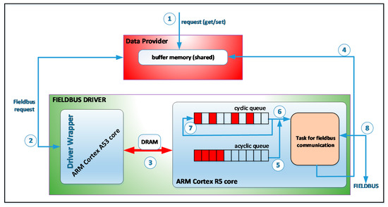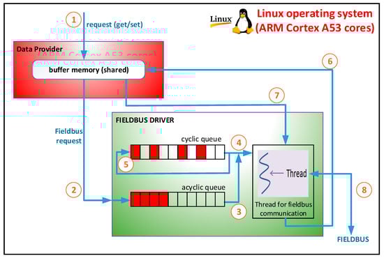 Figure 3 presents an operation diagram for a fieldbus driver when general-purpose CPUs (such as the ARM Cortex A53 cores) are used and specialized coprocessors are not. In this case, all modules of the fog node are executed on the Linux operating system that runs on the ARM Cortex A53 cores. The data provider receives read and write requests for the defined objects (see (1) in Figure 3). If data provider receives a write request then the data is updated in the buffer memory and a write request is sent to the fieldbus driver (see (2) in Figure 3).