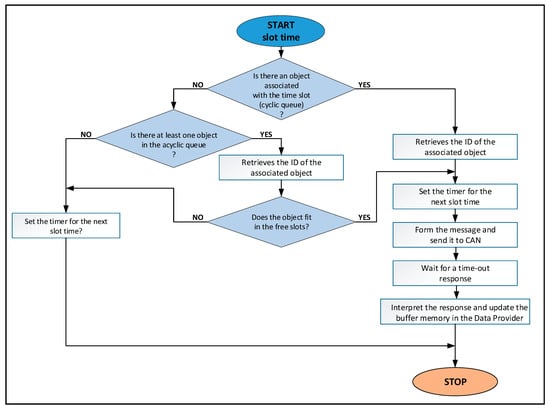 As can be seen in Figure 3, within the fieldbus driver there are two queues. A queue is associated with the acquisition cycle, with one item for each slot (cyclic queue). The second queue contains requests for objects that are not included in the acquisition cycle (acyclic queue). The driver has a thread that runs periodically at the beginning of each slot. This thread extracts an item from the queue associated with the acquisition cycle. If this slot is associated with an object, then the request for that object will be processed (see (4) and (5) in Figure 3). If the slot is not associated with an object then an item is removed from the queue with asynchronous requests and the request for that object is processed (see (3) in Figure 3). This operation requires communication on the CANOpen fieldbus (see (8) in Figure 3). The result of the communication operations on the CANOpen fieldbus is sent to the buffer memory (see (6) from Figure 3). Data that is transmitted on the fieldbus can be retrieved from the buffer memory (see (7) from Figure 3). The buffer memory is protected by a semaphore to achieve mutual exclusion when it is accessed. Figure 4 presents the activity diagram of the thread that is executed at the beginning of each slot. Algorithm 1 presents the pseudocode for the activity diagram from Figure 4. If the object has associated two or more slots then the time-out and the next activation of the thread are adjusted accordingly.