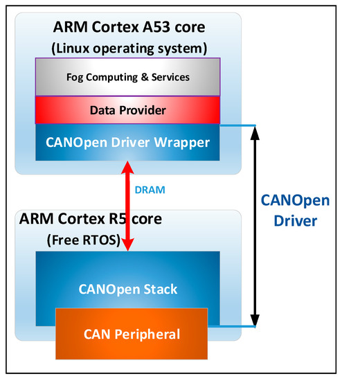 Figure 5 presents the software architecture of the driver for CANOpen fieldbus. It has a software component on the ARM Cortex A53 core that is executed under the Linux environment and a software component that is executed by the ARM Cortex R5 core. On the specialized core, the software component that implements the CANOpen stack is based on the CAN peripheral provided by the SoC system.