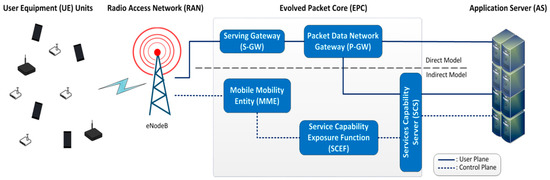 - 3GPP. TS 23.682 Architecture Enhancements to Facilitate Communications with Packet Data Networks and Applications; (Rel. 13) v13.11.0; 3rd Generation Partnership Project: Valbonne, France, 2018; Available online: https://www.etsi.org/deliver/etsi_ts/123600_123699/123682/13.11.00_60/ts_123682v131100p.pdf (accessed on 30 March 2020).