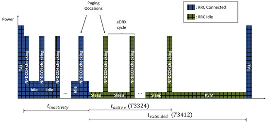 Another important inheritance of the LTE standard has to do with the mechanisms for reducing the energy consumption of user equipment (UE). These are two optional functions, although highly recommended for reducing the consumption of network devices. On the one hand, eDRX consists of alternating brief periods in which the channel is actively listened for data reception (intervals with high power consumption) with intervals in which the UE does not attend possible receptions by monitoring the NPDCCH (intervals with low power consumption). This periodic procedure is called paging. For the sake of illustration, Figure 3 represents the UE power behavior between two consecutive tracking area updates (TAU) when no packets are transmitted between device and the evolved node base station (eNodeB). Typically, each paging cycle consists of one or more paging occasions followed by a sleep period, until the paging time window (PTW) is completed. This cyclical DRX behavior can occur while the device is in radio resource control (RRC) Connected or RRC Idle states. On the other hand, through the PSM mode the UE works in a very low consumption state where accessibility from the network is not available for sending or receiving messages. However, when leaving the PSM, no reassociation to the network is required since the registration information is preserved in the EPC and the device remains registered. It should be noted that this configuration can affect the latency of the communications on the DL, as the device does not receive any data while it is in PSM. It is the PSM which has the highest impact on the power consumption of the IoT network, being essential for the battery life objective of the UEs of more than 10 years with a 5 Wh battery, established by the 3GPP [62,63,64]. In addition to eDRX and PSM, the configuration of the NB-IoT link becomes relevant in the long-term consumption of the UE. Specifically, it is conditioned by the values of the following parameters: (1) inactivity timer, (2) extended timer, (3) active timer, (4) data rate, (5) number of UL/DL segments, (6) number of repetitions, and (7) modulation tones. More detail about the role of these configuration parameters can be found in [14,64,65].