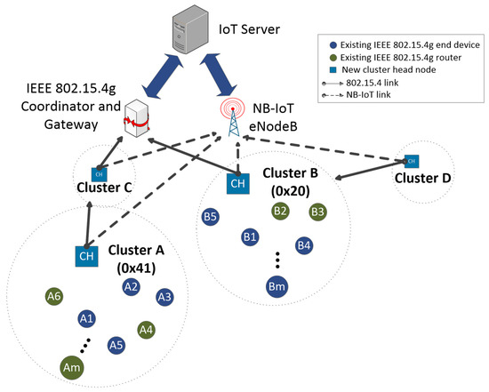 The proposed combined network consists of the nodes of the original LR-WPAN and new devices with dual NB-IoT and IEEE 802.15.4g connectivity. These latest devices are named dual nodes. Combined network architecture at device-level is shown in Figure 4, where nodes are distributed into clusters and new dual nodes act as CHs. At any time, dual nodes can relay data as FFD routers of the 802.15.4 network or as data aggregators from the EDs of the cluster through NB-IoT, depending on which link is dynamically selected. Clusters are organized hierarchically, consisting of one CH and several EDs connected to it. Let us define as the maximum number of EDs connected to a CH. A star topology is selected for each cluster, eliminating the original tree structure that allowed up to four hops. In this way, the number of retransmissions is reduced, the energy efficiency of the network increases and its latency is reduced.
