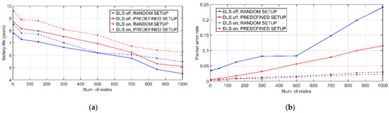 Effects of DLS algorithm on the combined network as a function of network population: (a) battery lifetime; (b) packet error rate.
