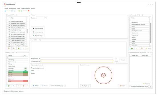 During the session with the patient, the rehabilitator can observe the patient (from the point of view of the device) on the Control panel using the built-in cameras, he/she can also listen to the surroundings using the built-in microphone. In the Chat section the system operator can communicate with the patient. First, the patient’s speech is translated into text and is displayed in the text field. The user can use a predefined item in the Sound section or can write own ad hoc text in the message window. The text is synthesized into speech and played on the robot’s speakers. The user can also use Emotions or Behaviors section item to show a different face on the screen or make a move. The movements can also be performed using the on-screen controller or joystick. The last section described is Recommendations. The machine learning subsystem is a set of many microservices responsible for detecting people [] and things, emotions, speech and cause-and-effect relationship detection. It also can recognize elements of the environment such as toys and also propose actions such as movement sequences, reactions to the patient, display emotions on the screen, etc. According to the processed data the machine learning gives propositions for the action that should be performed by the DreamRobot.