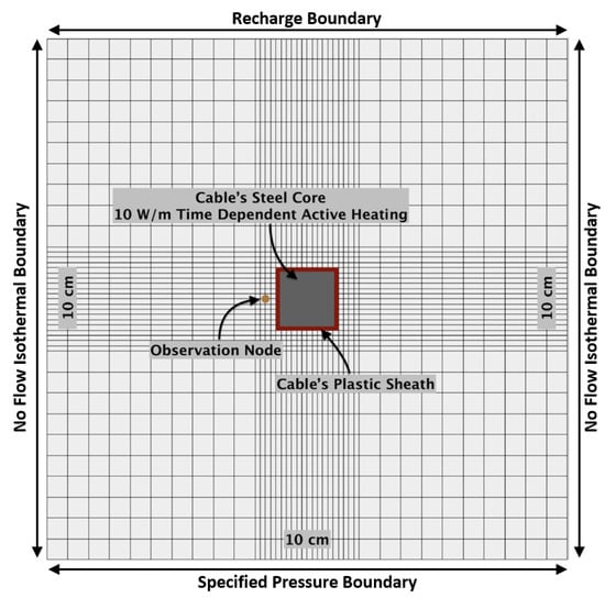 The model domain represents a homogeneous, medium-grained sand surrounding the fiber-optic cable located in the center of the model domain. The fiber-optic cable is represented by a 0.01 m × 0.01 m steel core surrounded by a 0.001 m thick plastic sheathing. Each medium (sand, plastic, and steel) has its own set of hydraulic and thermal properties (Table 1). The permeability of the steel core and plastic sheath have been set to be effectively impermeable (10−90 m2) to avoid water flowing through the cable. The representation of the optical fiber is omitted from the simulations as the thermal effect of the thin glass fiber at the center of the steel core is assumed to be negligible.