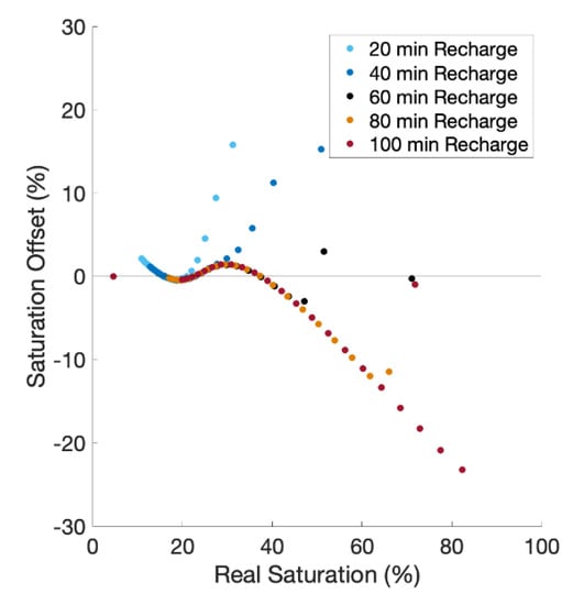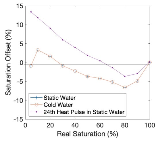 The effect of 24 cycles of 15 min heat pulses at one-hour intervals results in an R2 of 0.99 when comparing the soil saturation at the observation node to the calculated protocol value at the end of the 24th cycle. The saturation offset (i.e., the difference in aFO-DTS calculated and observation node value) is within ±4% for saturations at or above 40% (Figure 3). Below 40% saturation, the aFO-DTS protocol has a saturation bias greater than +4%, and the offset is 13.4% at residual saturation levels. This suggests that the error associated with repeated heating cycles at low saturation may be a potential source of error. The error in the saturation calculation initially increases with each heat pulse but reaches a plateau by the 4th cycle. A shorter integration period may reduce the offset at lower saturations.
