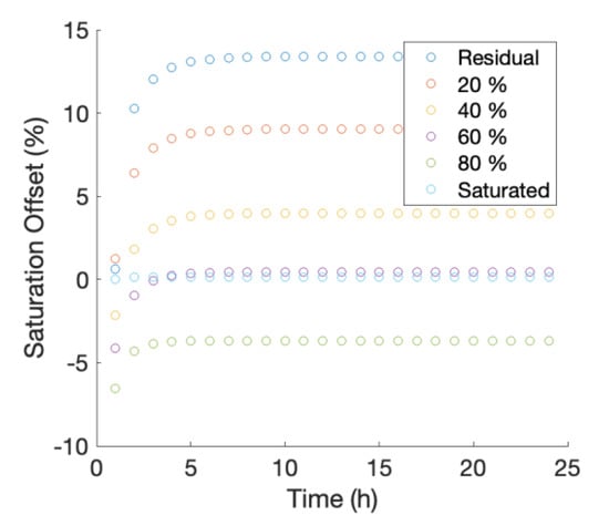 Effect of repeated heat pulses (one cycle per hour, for 24 h) on aFO-DTS accuracy for different saturations. Accuracy, represented by saturation-offset, decreases over the first four heat cycles after which the offset is constant for subsequent heat pulses.