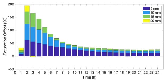 aFO-DTS results using the 15-min calibration for 5, 10, 15, and 20 mm of recharge. Recharge occurs during the second hour of the test. The bar chart is cumulative; for example, at 2 h, the saturation offset for the 20 mm simulation is 39%.