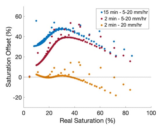 The large offset is a result of the calibration method. Tcum is measured during a 15-min period, during which time it is assumed the saturation levels remain constant. With the introduction of flowing pore water, saturation changes throughout the heat pulse measurement period. Heat transfer not only increases through the wetting front, but additional cooler recharge water following the wetting front removes additional heat which is not experienced with the static simulations. The calibration curve is also more sensitive to the length of the heat pulse at lower water contents due to its shape where smaller differences in Tcum at lower saturations account for larger changes in soil saturation. For example, the difference in Tcum between 10% and 20% saturation is 614 s°C and between 90% and 100% saturation is 1269 s°C.
