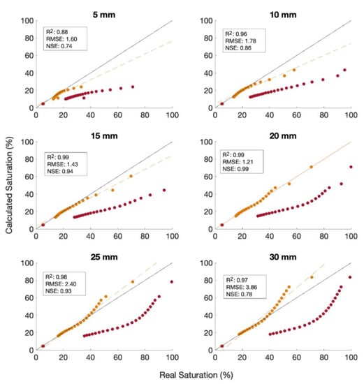 The effect on accuracy of the aFO-DTS protocol of water colder than the antecedent ambient temperature of the bulk medium is negligible (Figure 2). The drop in water temperature to 10 °C and 5 °C from an initial 20 °C produced a change in soil saturation value of ±0.01%, and the R2 remains 0.99.