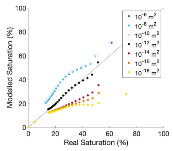 The effect on aFO-DTS accuracy due to permeability values changing in the region surrounding the fiber-optic cable relative to the saturation measured by the observation node with the default permeability conditions. These simulations test the effect of variability in soil permeability rather than the protocol’s ability to account for changes in permeability relative to the observation node’s location.