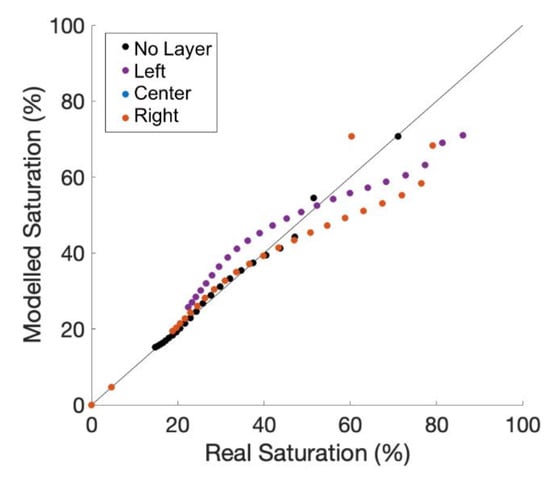 The effect of heterogeneity in the soil matrix is evaluated using the Section 2.6.5 calibration with different scenarios. First, the sand domain’s permeability is adjusted to a gaussian distribution with extremums of two orders of magnitude below and above the default permeability value of 10−12 m2. To reduce the impact of local heterogeneity at the point of measurement, the soil saturation measurements are compared at three observation nodes, located above, to the left, and to the right of the cable. The left observation node is shown in Figure 1, and the above and right observation nodes are also 0.002 m from the edge of the cable.