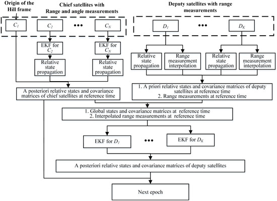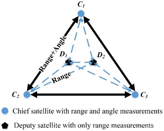 Two-satellite relative navigation based on a single inter-satellite relative measurement (inter-satellite range measurement, angle measurement, or range-rate measurement) has been extensively studied. For angles-only relative navigation, David C. Woffinden et al. [3] studied the observability criteria; Francisco J. Franquiz et al. [4] proposed optimal range observability maneuvers and trajectory planning methods for spacecraft formations under constrained relative orbital motion; Jianjun Luo et al. [5] developed angles-only relative navigation and guidance coupling algorithm in the context of Clohessy–Wiltshire and Tschauner–Hempel dynamics; and Baichun Gong et al. [6] studied the angles-only relative navigation problem for spacecraft proximity operations when the camera offset from the vehicle center-of-mass allows for range observability. For range-only relative navigation, John A. Christian [7] explored the observability of range-only relative navigation and revealed the multiplicities of possible relative trajectories of various special relative orbits; Yanghe Shen et al. [8] conducted relative orbit determination with quantum ranging, which provides more accurate range measurement than traditional methods; and Daan C. Massen et al. [9] and Frank R. Chavez et al. [10] utilized relative orbital elements instead of Hill coordinates for relative orbit determination. Besides, Cagri Kilic et al. [11] explored the relative navigation of a formation of small satellites using only range-rate measurements that may be acquired using radio hardware already on the spacecraft.