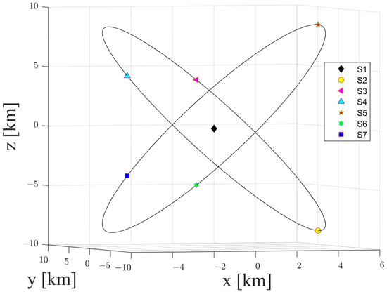 The Satellite Tool Kit (STK) software [30] is used to generate data for the seven-satellite space-circle formation. The initial state error of satellite () is set to