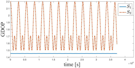 As the structure of the seven-satellite space-circle formation is symmetrical, the geometric locations of satellites can be considered to be equivalent. Take as an example. The GDOP values of satellites and are compared in Figure 10. The mean GDOP value of is 1.45, which is significantly smaller than that of (mean GDOP value = 1.78). The effect of GDOP on the relative navigation accuracy of deputy satellites is analyzed later.