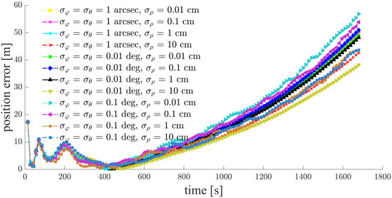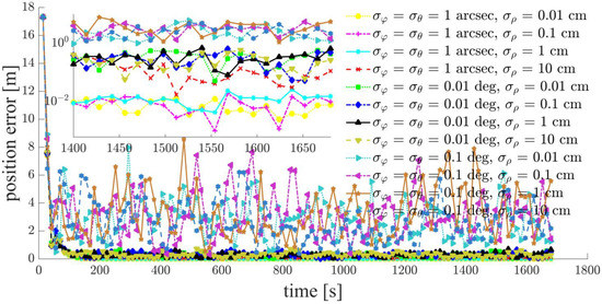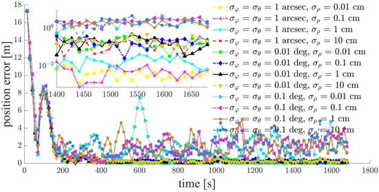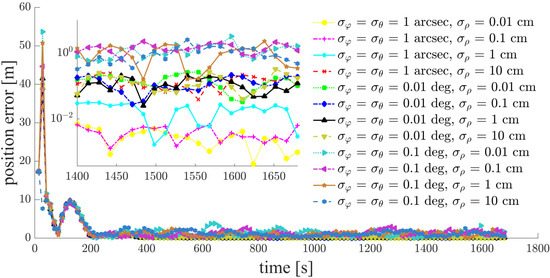 As inferred above, the relative navigation algorithm for the deputy satellites will diverge in Case e; this is verified by the simulation results in Figure 17. Therefore, no statistics are presented for Case e.