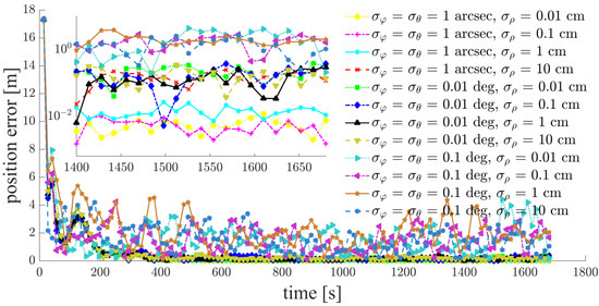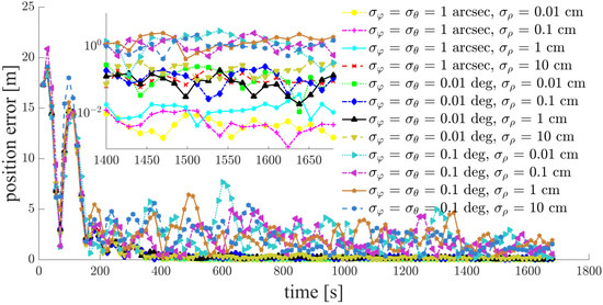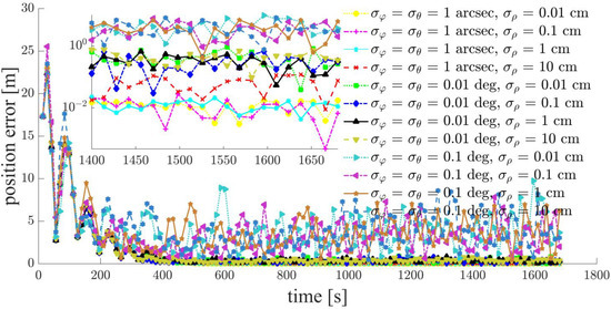 The time slot of the distributed multi-satellite measurement scheme is 1 s and the measurement period is 14 s for the seven-satellite formation. The process noise covariance matrix is