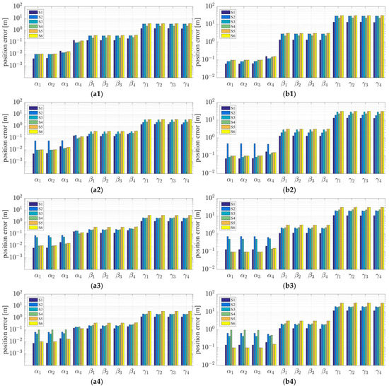 Statistics on the relative navigation accuracy under different simulation scenarios: (a1) Case a: space-circle radius 1 km and 6 chief satellites; (b1) Case a: space-circle radius 10 km and 6 chief satellites; (a2) Case b: space-circle radius 1 km and 5 chief satellites; (b2) Case b: space-circle radius 10 km and 5 chief satellites; (a3) Case c: space-circle radius 1 km and 4 chief satellites; (b3) Case c: space-circle radius 10 km and 4 chief satellites; (a4) Case d: space-circle radius 1 km and 3 chief satellites; (b4) Case d: space-circle radius 10 km and 3 chief satellites.