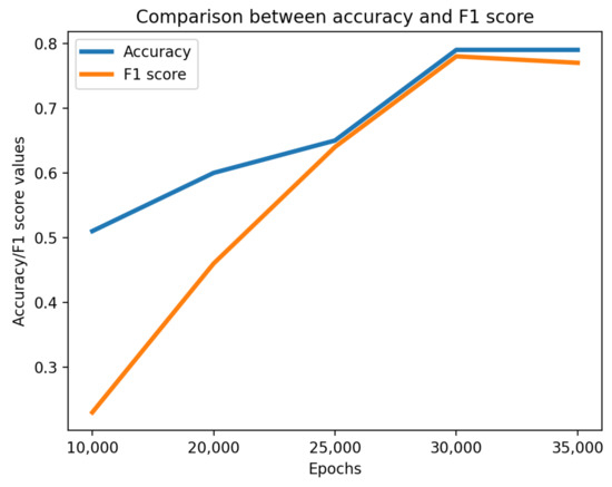 Several independent runs of data augmentation are provided with different numbers of epochs (the rest of the neural structures are left untouched). One thousand synthetic samples were generated. The inherent results are presented in Table 1 and Figure 3.