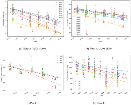 Figure 3d, that has no significant effect on the linear degradation fit. Finally, there is a higher degradation in power for some of the inverters in plant A, such as 1U02, 1U04, 1U09, and 2U02 (