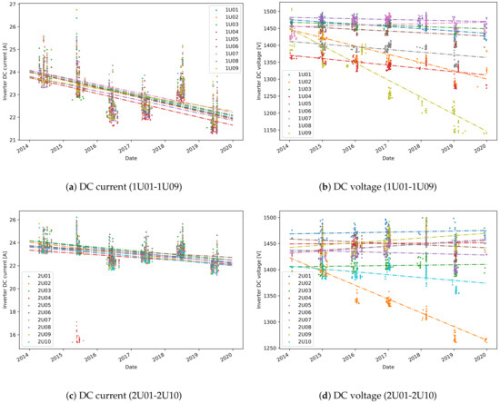 Figure 12d). On the other hand, for inverter 2U08, the events in 2019 are related to an unusual increase in voltage seen in the morning.
