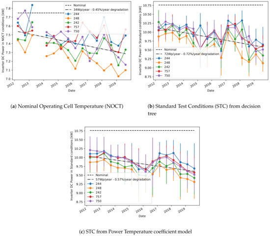 Figure 5 shows the predicted power in STC or NOCT conditions for each of the considered inverters in plant C. All curves are collectively fitted with a linear model, to have an estimate of the overall decreasing trend. Moreover, the dashed horizontal line shows the nominal power as communicated by the modules manufacturer. The vertical lines at each point estimate the uncertainty of the power estimates, and this is always much higher in STC because of the lack of one prediction input (the ambient temperature) and the lower amount of data available for training the models. Additionally,