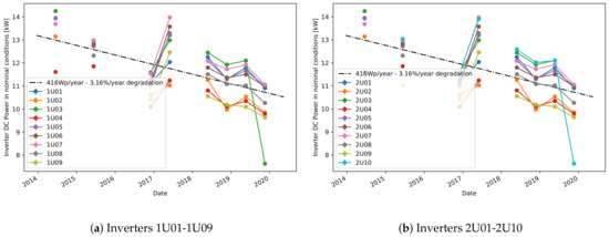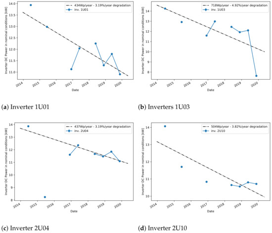 Figure 3a,b). A significant drop in DC power is seen for the inverter 2U04 in 2015, where the selected points deviate highly from all others. Including these sampled points in the degradation analysis affects highly the YDS. Hence, for better accuracy, these selected points are omitted from the degradation analysis.