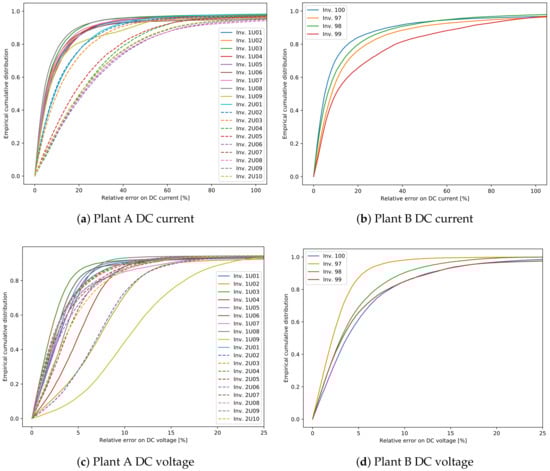 Figure 8 shows the cumulative distributions of the relative errors in the predicted voltage and current for each of the two plants and each inverter on the test set. For this plot only the points where the current is higher than 5% of the maximum measured inverter’s current are considered, in order to focus only on times of operation. As immediately apparent, the error on the voltage prediction is usually much lower than the one on the current, which is then the most important contribution to the error in predicted power. Noted that there is a relatively large difference in errors between the different inverters, which has to be investigated.
