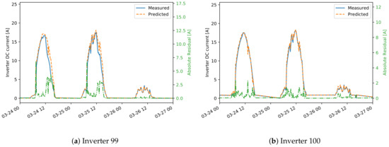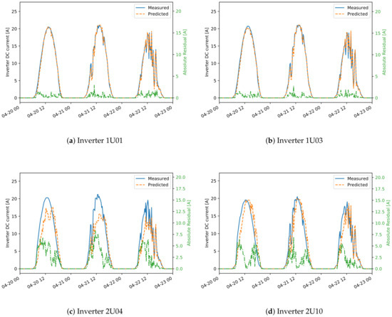 Figure 10 show comparisons between measured and predicted DC currents for some inverters of the two plants. For plant A (