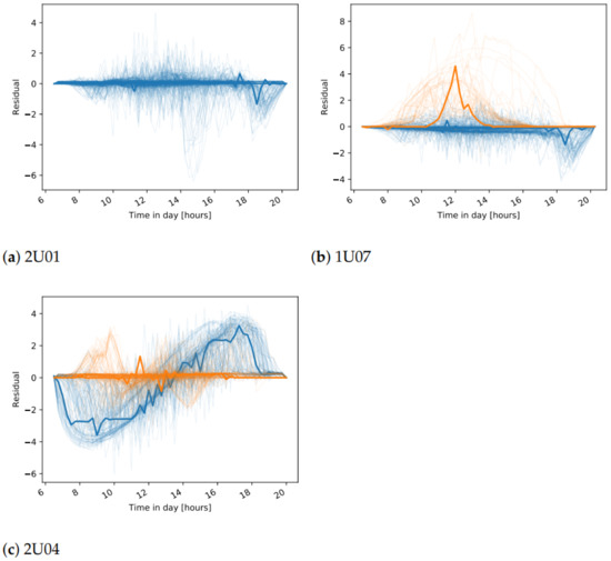 Figure 11c). The final observation is that in a few of the cases on DC voltage daily residuals, except for the expected cluster around the 0-residuals, an additional one is found. One explanation is that natural shadows cause the modeled and reference inverter to start and end the daily operation at different times of the day. Hence, higher residuals are seen at the start or end of the day, which is later identified as a separate cluster. It can then be concluded that such a second cluster also shows a normal pattern since it represents a particular feature of the inverter.