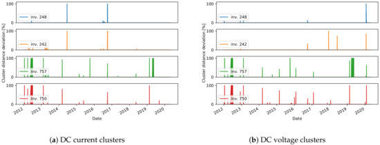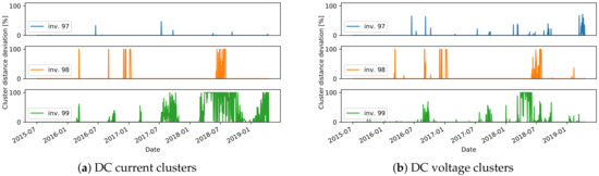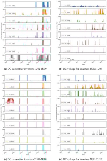 Figure 12d), which are related to short-term increase or decrease in voltage in several hours in the afternoon. In another example, current-related events are detected for inverter 99, where the current measured for short periods in the afternoon has lower values (