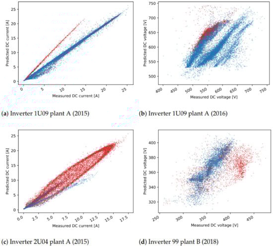 Figure 12a) for inverter 1U09. A scatter plot of the measured values for DC current and the predicted values with the ML model is shown in