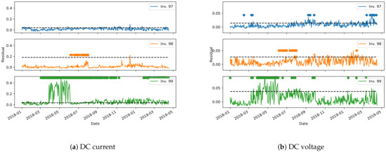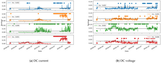 Figure 17 show the derived control charts for DC current and voltage on the most representative inverters of plants A and B. The dashed horizontal line is the limit defined by Equation (