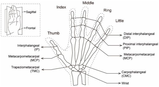 The motion angles of each joint of the hand and wrist together constitute the gesture posture, which conveys different semantics. Due to the different anatomical structure and movement methods, studies of sign language typically discuss the thumb separately from the other four fingers, which are usually discussed together [4,5,6]. Figure 1 shows the general hand skeleton structure and the corresponding naming method. The joints that control the thumb movement are called trapeziometacarpal (TMC), metacarpophalangeal (MCP), and interphalangeal (IP). The control joints corresponding to the other four fingers are named carpometacarpal (CMC), metacarpophalangeal (MCP), proximal interphalangeal (PIP), and distal interphalangeal (DIP) [7,8,9].