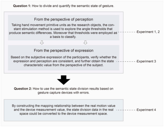 As shown in Figure 3, Experiments 1, 2, and 3 were designed to obtain discrete gesture semantic space, including the number of semantic states of each motion primitive unit and the feature and critical value of each state. Moreover, a further experiment, i.e., Experiment 4, was designed, taking Leap Motion as an example to verify the practical application of gesture semantic state division. This section introduces the methods from three aspects: semantic perception state division based on constant stimulus method, state classification evaluation and feature angle extraction based on subjective expression, and practical example of semantic state division based on Leap Motion and data mapping.