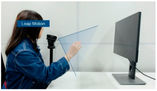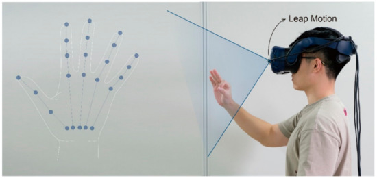 Leap Motion was used as the gesture capture device for Experiment 4. As shown in Figure 4, Leap Motion is the most widely used non-contact hand gesture capture sensor [42,43,44], which can provide the position and motion data of each joint of the hand in desktop mode or VR mode. Based on these data, information such as the bending angle of each joint and the abduction angle of the fingers can be further obtained and used to gesture recognition and gesture interaction. Nevertheless, a certain systematic measurement error about 15 percentage of the hole motion range was demonstrated in the experiments [45]. Therefore, in some cases, the data given by Leap Motion may not truly reflect the user’s hand gestures, resulting in a degradation of the efficiency of Leap Motion–based gesture recognition and the experience of gesture interaction.