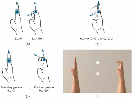 Research on gestures provides practical discrete gesture codes [33,34,35] and the range of motion and constraint relations of each joint of the hand [6,11,17,18,19,37]. However, the discrete classification of the motion state of each joint still lacks objective consideration from perception and expression aspects and has not been correlated with the motion angle of joints to give a clear angle threshold and characteristic value. Besides, the measurement deviation of the hand gesture capture device represented by Leap Motion also leads to the inconsistent between actual intention and the recognition intention in the gesture interaction. These are the problems that the current study set out to explore and solve.
