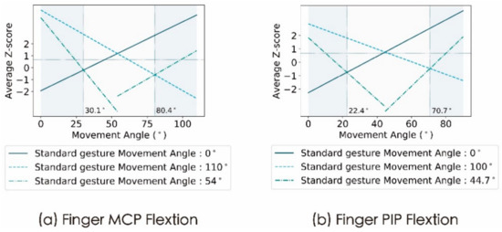 Two intersection points between the two sections of semantic difference change curves under the median gesture and the two curves under the boundary gesture can be seen in Figure 8. These intersection points can be used as demarcation points to divide the entire finger MCP and finger PIP motion range into three parts as shown in Figure 7. Since the average Z score corresponding to the intersection point was less than 0.67, in the left and right parts of the above division, the visual semantic perception of the gesture was consistent with the corresponding boundary gesture, and the visual semantic perception of the gesture in the middle part was consistent with the median gesture. Thus, the number of semantic states that can be conveyed by the two-motion primitive unit finger MCP and finger PIP should be three.