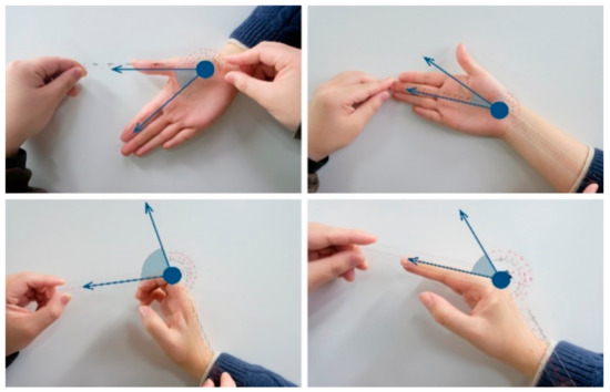 There is a large volume of research on the range of joint motion, including active range of motion (aROM) [10,11,12,13,14,15] and functional range of motion (fROM) which represent activities of daily living [7,11,12,15,16]. Depending on the joints and movement, fROM is 5° to 28° smaller than the available aROM [11,12,16]. The joint motion range corresponding to the execution process of the intentional gesture should be aROM. The aROM of the wrist and hand joints in the two orthogonal directions reported by the relevant research is shown in Table 1.