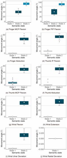 Through the discussion of the three experimental results, we have merged the motion primitive units, which were from the same joint and had the same degree of freedom. We determined eight motion primitive units: finger MCP flexion, finger PIP flexion, finger abduction, thumb MCP flexion, thumb IP flexion, thumb abduction, wrist bending, and wrist deviation. Finally, the quantitative classification results of the semantic state of each motion primitive unit that were consistent within groups and conformed to human expression and perception were obtained and shown in Table 5. The number of joint semantic states of each motion primitive unit is between 2 and 3 and has a strong correlation with the motion amplitude of the motion primitive unit. The motion amplitude of the motion primitive unit with the number of states of 3 is greater than or equal to 90°. Except for the thumb MCP flexion, the characteristic motion angles of the first state of the other motion primitive units were all 0°, showing a high consistency. However, since the thumb MCP flexion has a particular angle in the extended state due to its bone structure even without external force intervention, it showed a characteristic value of 5°.