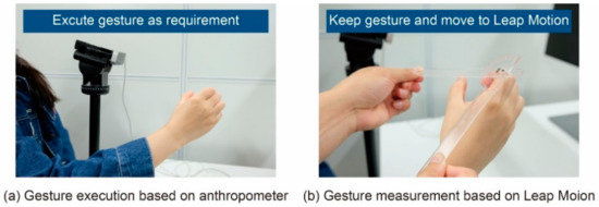The experimental equipment was consistent with Experiments 1 and 2. The motion animation of the gesture was made in the Unity virtual scene constructed in Experiment 1. Furthermore, as shown in Figure 9, the motion angles of the motion primitive unit were measured by an anthropometer, the universal human-joint measuring equipment [45].